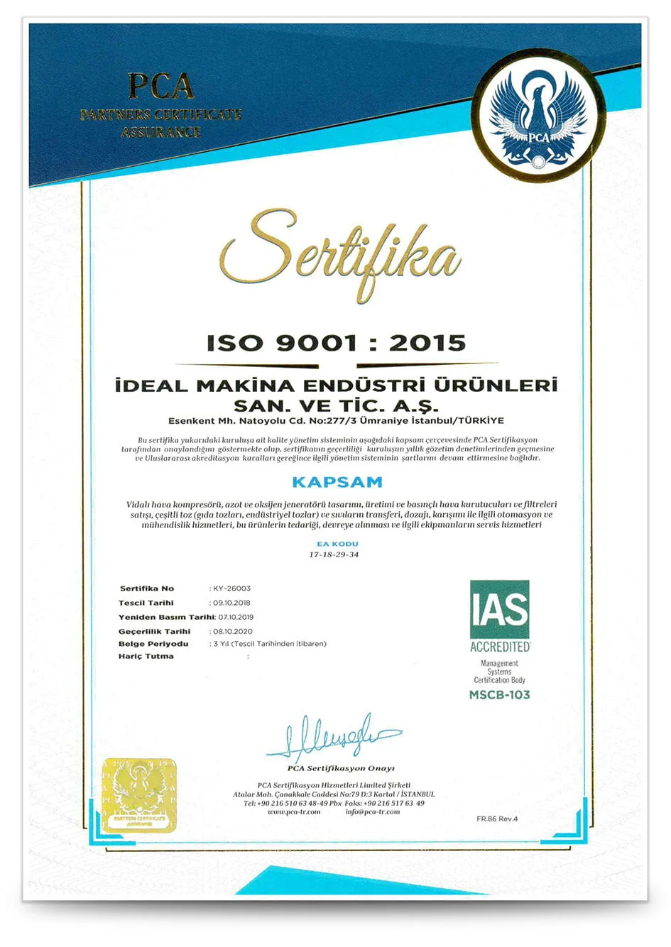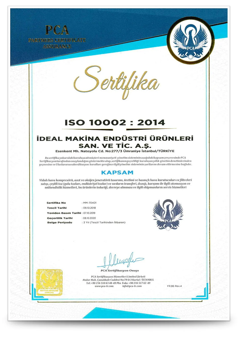 İdeal Makina müşteri beklenti ve sorunlarına kulak verir, taahhütlerini hızlı ve istenilen şekilde yerine getirir, sorunlara zamanında çözüm üretir. İdeal Makina sunduğu hizmetlerin üstünlüğünün, müşterilerinin taleplerini tahmin etme temeline dayandığına inanır. Hizmet standartlarını her şart altında koruyan İdeal Makina, mutlak tutarlılık sağlar.